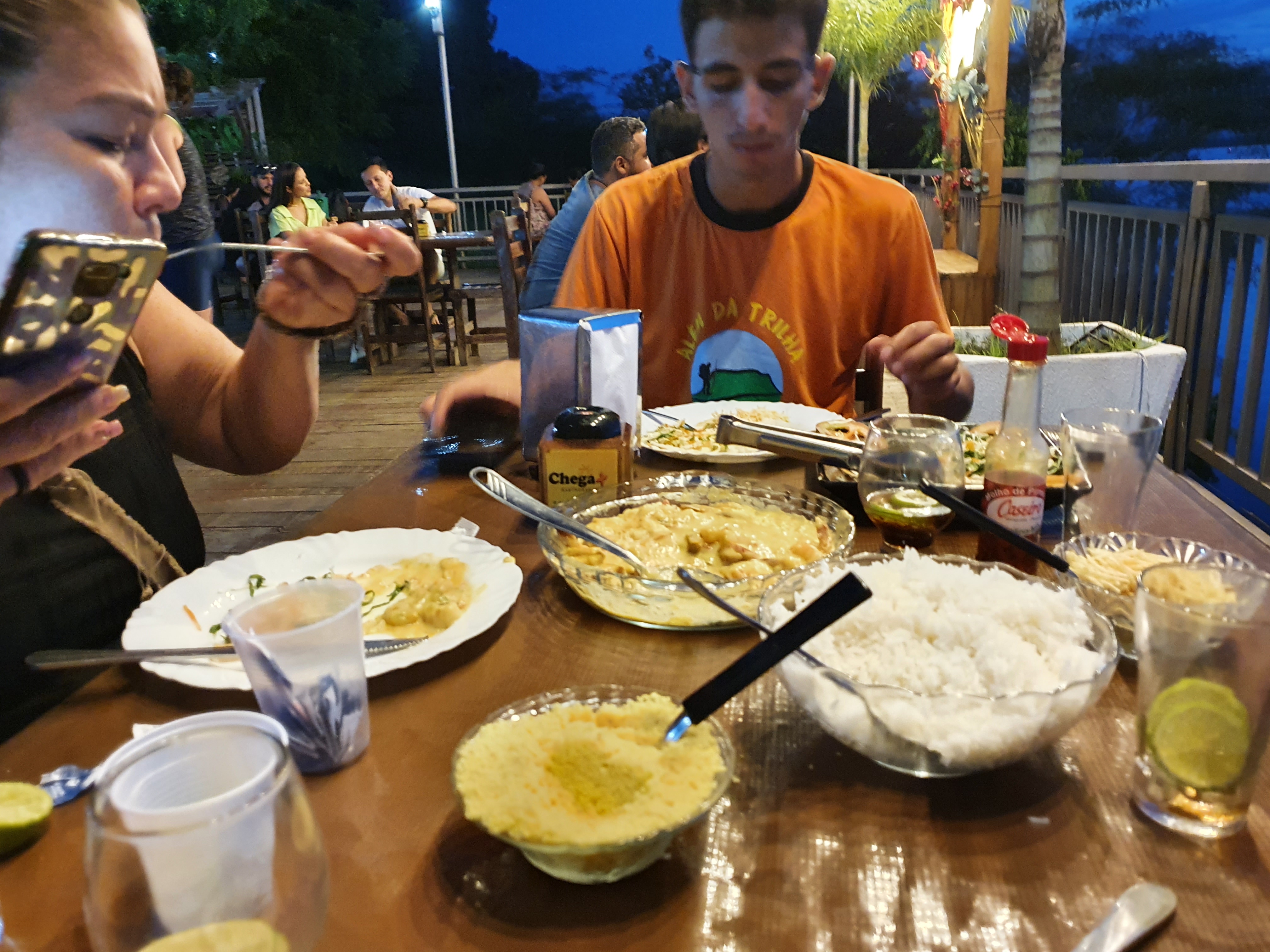 Nosso dia que começou as 7,30Am, já dava 4.30Pm e estávamos mortos e resolvemos assistir o pôr do sol e almoçarmos, dito e feito nosso guia Eduardo nos levou a um restaurante a beira do Rio Tocantins e demos muita sorte.