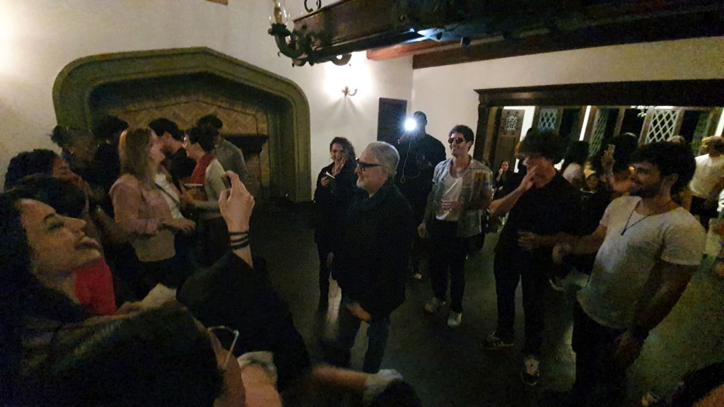 Como o local era no topo do mundo,sempre o clima é mais ameno do que ao nível do mar e aproveitando a noite invernal carioca o buffet, muito bem montado por acaso, era de caldos, queijos, vinhos,brioches,bolos, gim,cachaça, sucos e até cervejas geladas e frios.