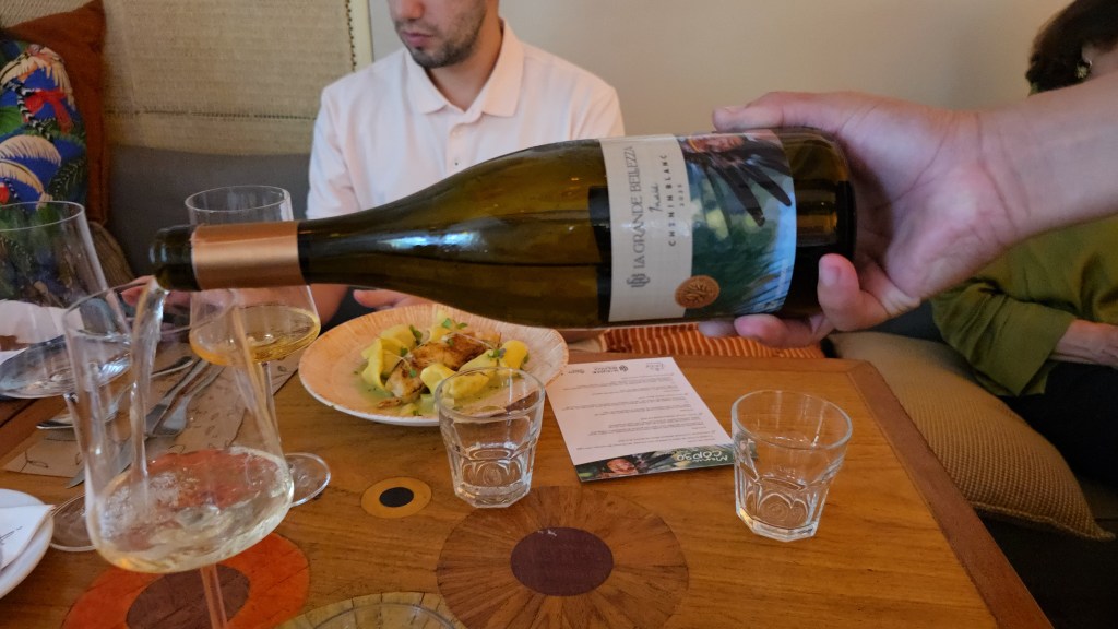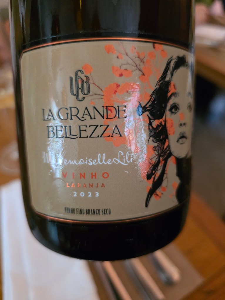 Para as entradas o exótico e saboroso vinho laranja Mademoiselle Lili safra 2023;