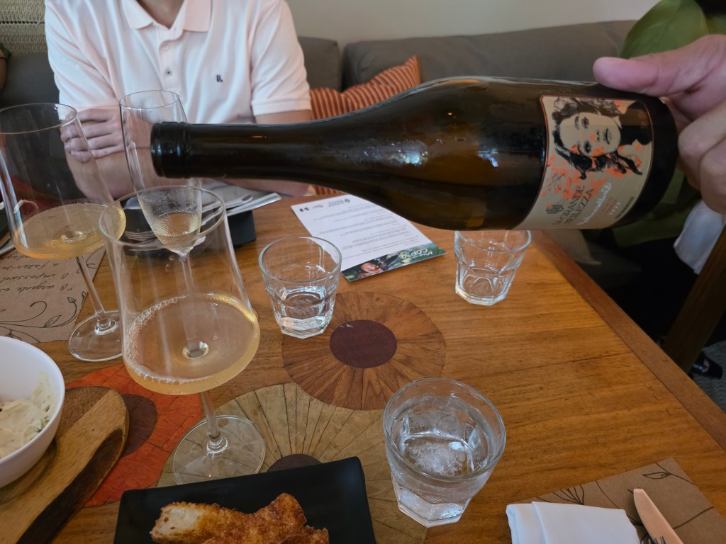Nos foram apresentados os seguintes vinhos: harmonizando com os snacks,o espumante La Grande Bellezza blanc brut safra 2021;