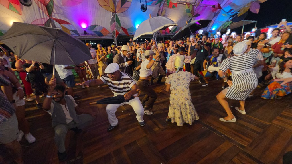 O maracatu é uma dança e rítmo afro-brasileiro de Pernambuco, surgido no século XVIII como resistência cultural, misturando influências africanas, portuguesas e indígenas. Caracteriza-se por cortejos reais (rei, rainha, dama do passo) com danças marcadas por giros, passos marcados e gingado, ao som pesado da percussão (alfaia) no Baque Virado ou mais livre no Baque Solto. Quem esteve presente na Casa Bloco foio Maracatu Piaba de Ouro do mestre Manuel Salustiano.