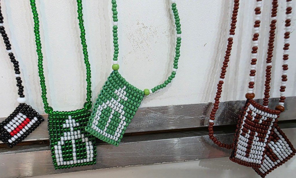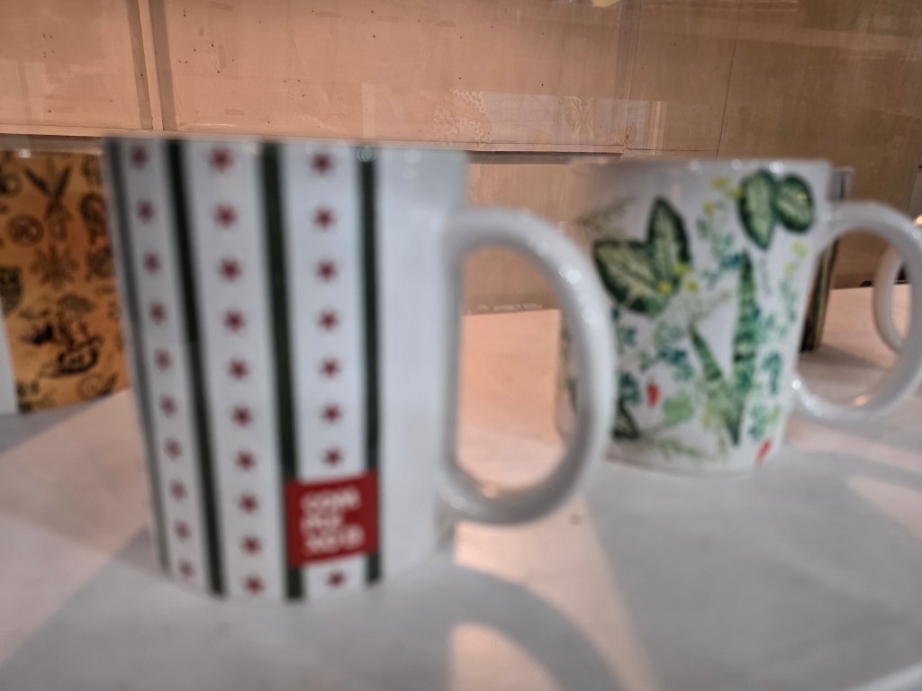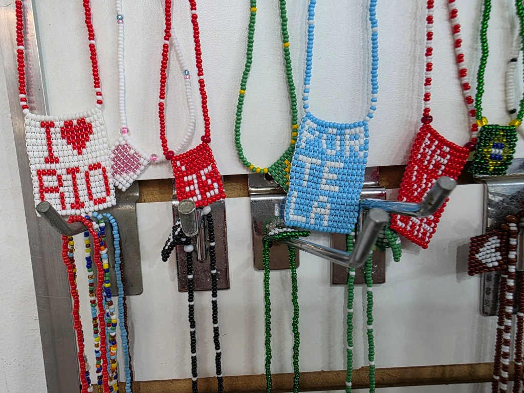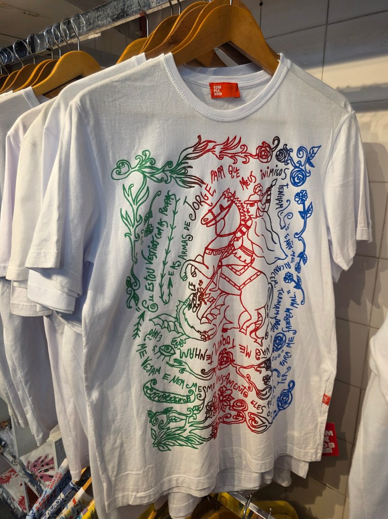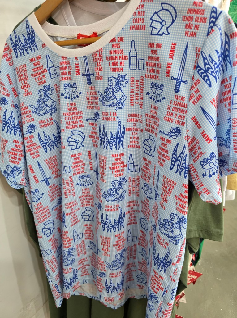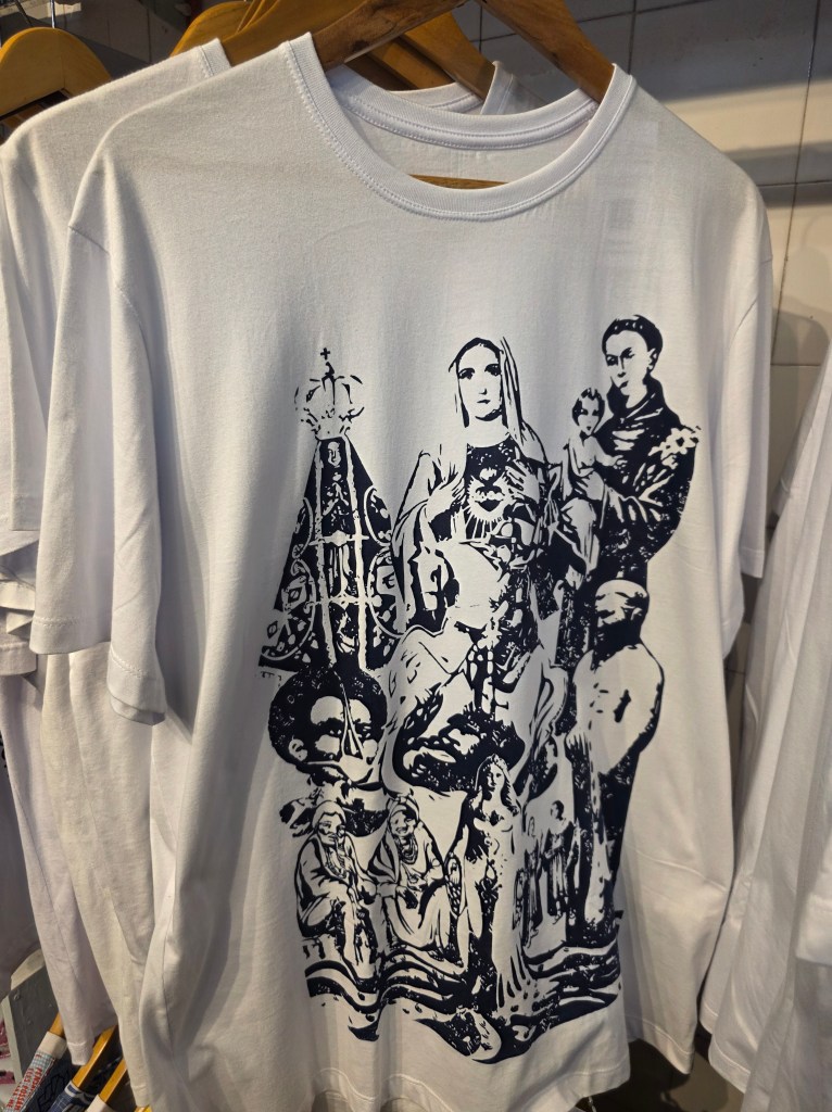 Símbolos religiosos também adornam acessórios como canecas, guias e na decoração da loja e se mistura com o profano.